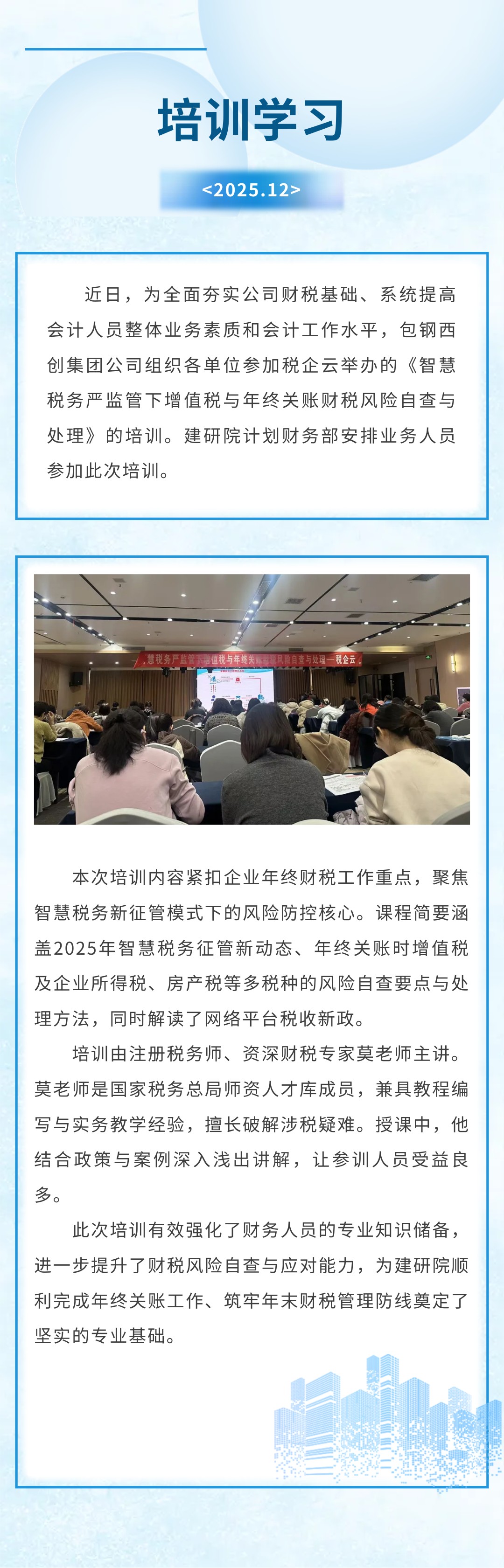 建研院积极参加“智慧税务严监管下增值税与年终关账财税风险自查与处理”培训