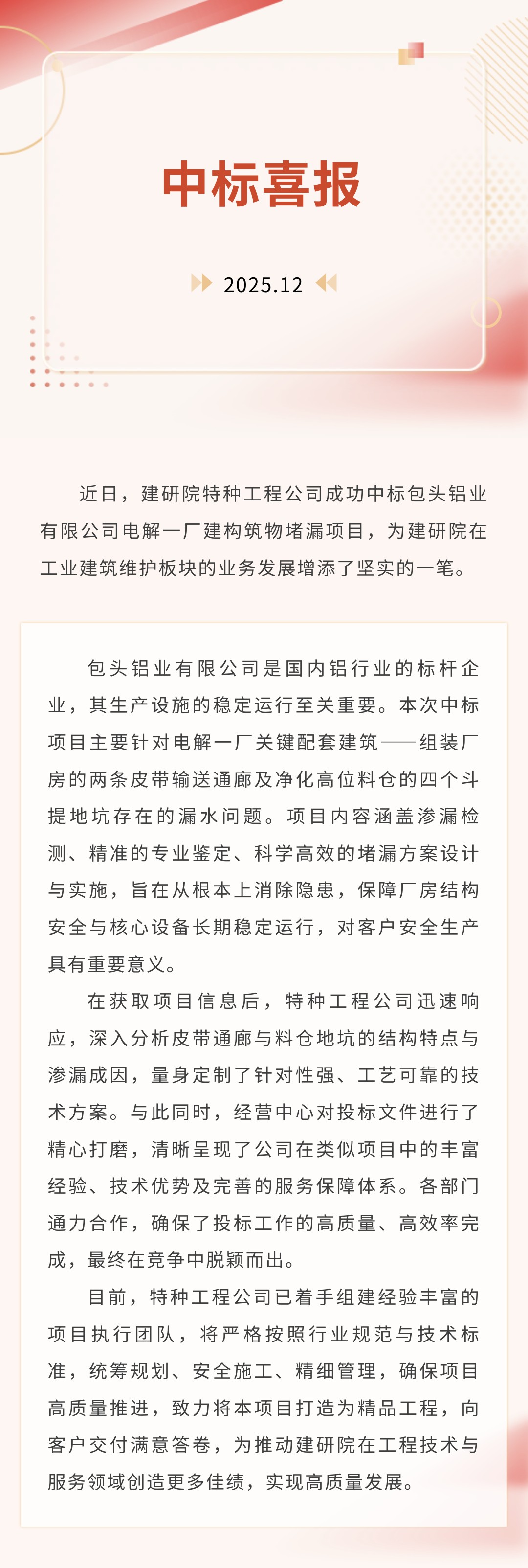 特种工程公司中标《包头铝业有限公司电解一厂建构筑物堵漏》项目