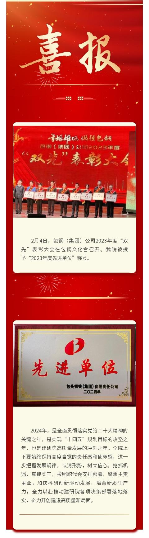喜报!包头冶金建筑研究院获评包钢(集团)公司2023年度“先进单位”荣誉称号