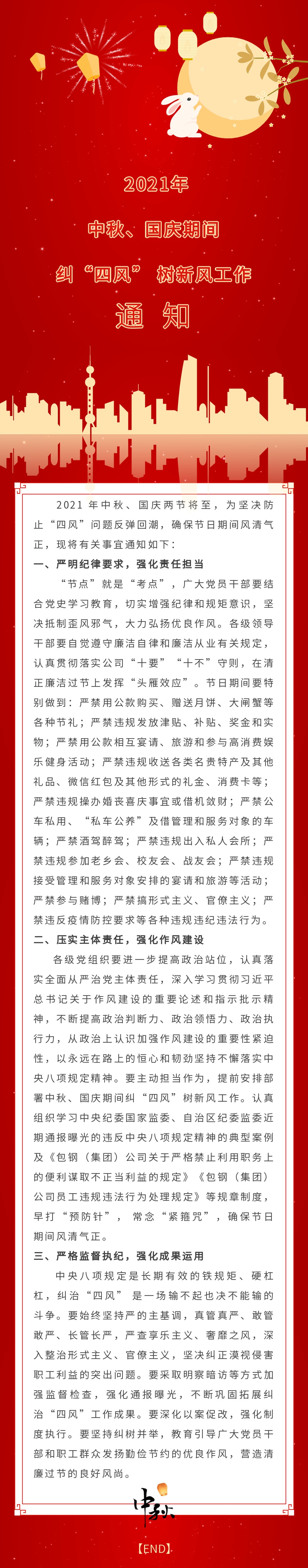 关于做好 2021 年中秋、国庆期间纠“四风” 树新风工作的通知
