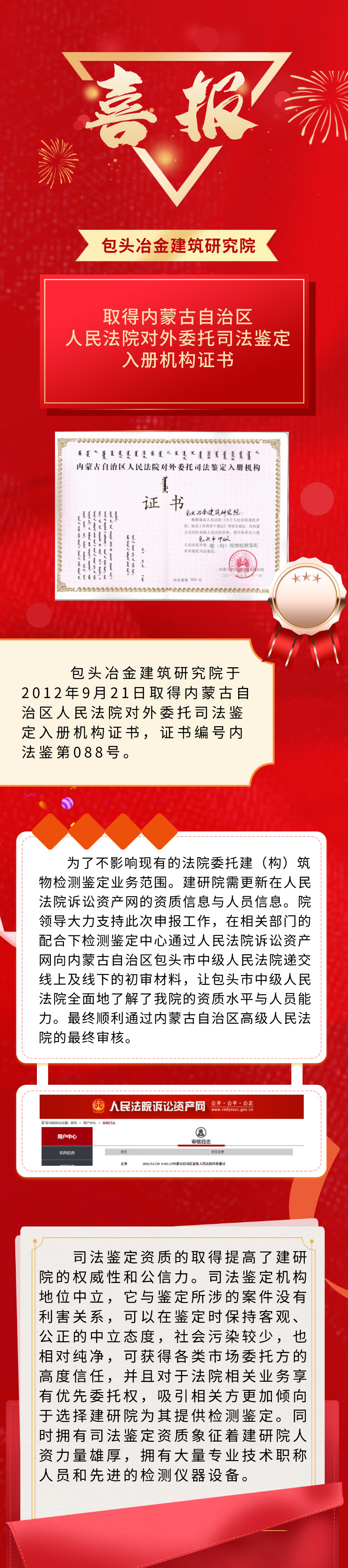 包头冶金建筑研究院取得内蒙古自治区人民法院对外委托司法鉴定入册机构证书